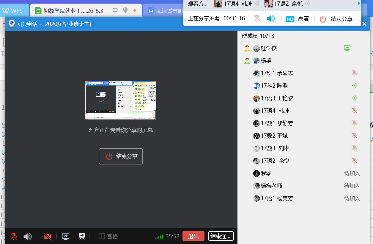 510日晚7点半,初教学院党总支书记杨艳老师,招就干事杜学佼老师,各毕业班班主任和辅导员老师们参加了“初教学院毕业班班主任会议”。会上,杜老师解读了我校就业工作绩效管理目标文件和我院2020届毕业生就业工作方案,并公布各班每周就业统计情况。毕业班班主任老师们交流了班级就业情况及目前存在的困难,杜学佼老师和韩坤老师分别从就业政策、西部计划等方面答疑解惑。杨艳书记动员班主任老师们高度重视、克服困难、积极行动,助力学生应聘就业和复习备考,关注各类招考信息,跟踪就业动态,帮扶困难学生,关注学生心理健康。
