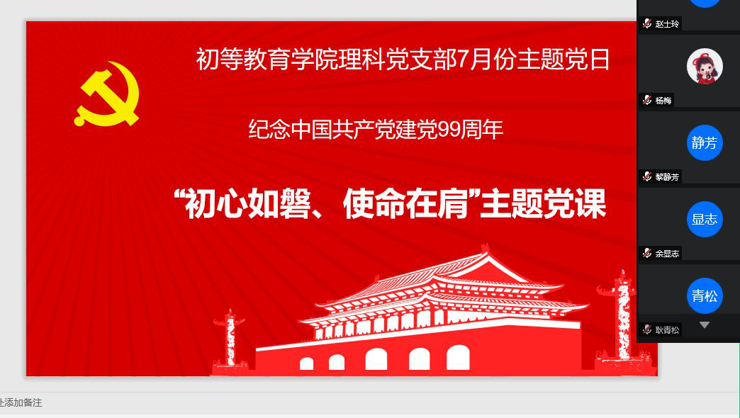 【本报讯 余显志】2020年7月8日晚7:30,在初教理科党支部书记柯文婷的组织下,借助腾讯会议平台,进行了初等教育学院理科党支部7月份主题党日活动,活动目的为纪念中国共产党建党99周年。本次党课授课讲师为占晓军老师,授课主题为“初心如磐、使命在肩”主题党课。