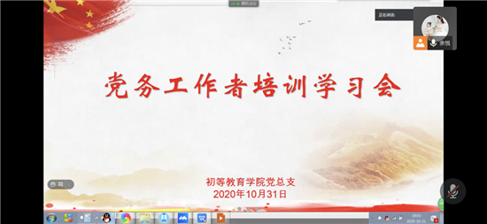 本站讯[通讯员 余悦]根据市委第四巡察组向我校反馈基层党支部组织生活不够落实问题提出的“专项治理”整改意见要求,按照党委整改工作部署,初等教育学院党总支为进一步推进整改落实,于10月31日晚上七点,通过腾讯会议召开党务工作者培训学习会。学院党总支书记、组织员及各党支部委员参加了本次会议。