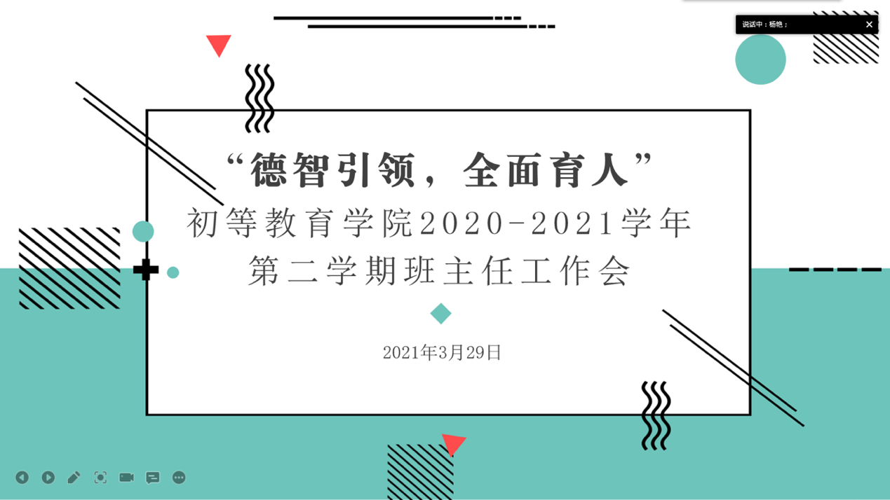 随后就三月的学生工作进行总结,并将四月即将开展的学生活动如创新创业大赛、感恩诚信征文、国家安全教育主题班会、五四评优、团校培训、入党积极分子培训班、党校培训、上巳节等进行布置,希望班主任老师们动员并指导学生积极参加。同时,即将到来的四月是第六个国家安全教育宣传月,就学生防诈骗等安全教育进行了重点提示,希望班主任老师们多提醒、常关注,积极创建无诈骗班级。在建党百年来临之际,及时关注学生的思想动态及舆论舆情,共同塑造积极向上、健康文明的班级风尚。