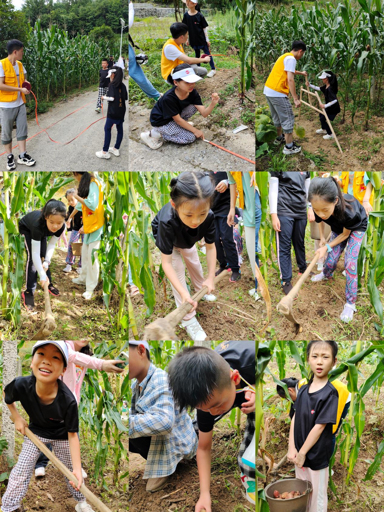 随后,小朋友们一起到田间地头学习如何丈量土地面积,以及挖土豆的方法。小队之间进行比拼,挖得最快最好的小队获胜。小朋友们卯足了劲儿,拿着锄头开始寻找地里的“黄金”。