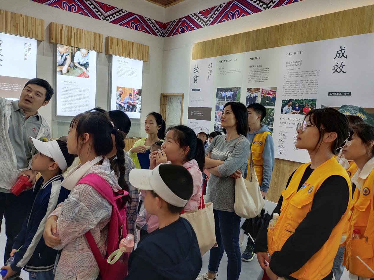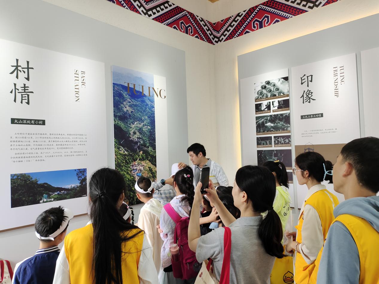 下午,在袁鸿杰老师的带领下,实践队员们和小朋友们一起去到了土岭村陈列馆。在这里,大家了解到了关于土岭村的缘起、未来、村情、印像等等,与土岭村有关的一切,都在这里为大家呈现。“大山深处有小村”、“旗帜引领战贫困”、“一颗初心,一生信仰”是土岭村的简介,“金岭”、“土岭春风”是土岭村的代名词。大家都相信,在未来土岭村会进一步巩固脱贫成效,以水晶葡萄为支撑,以绿色环保为依托,将土岭村打造成四季有花、三季有果的高山休闲度假区。