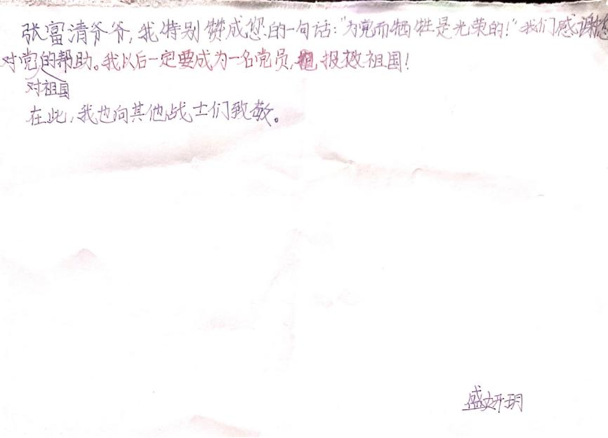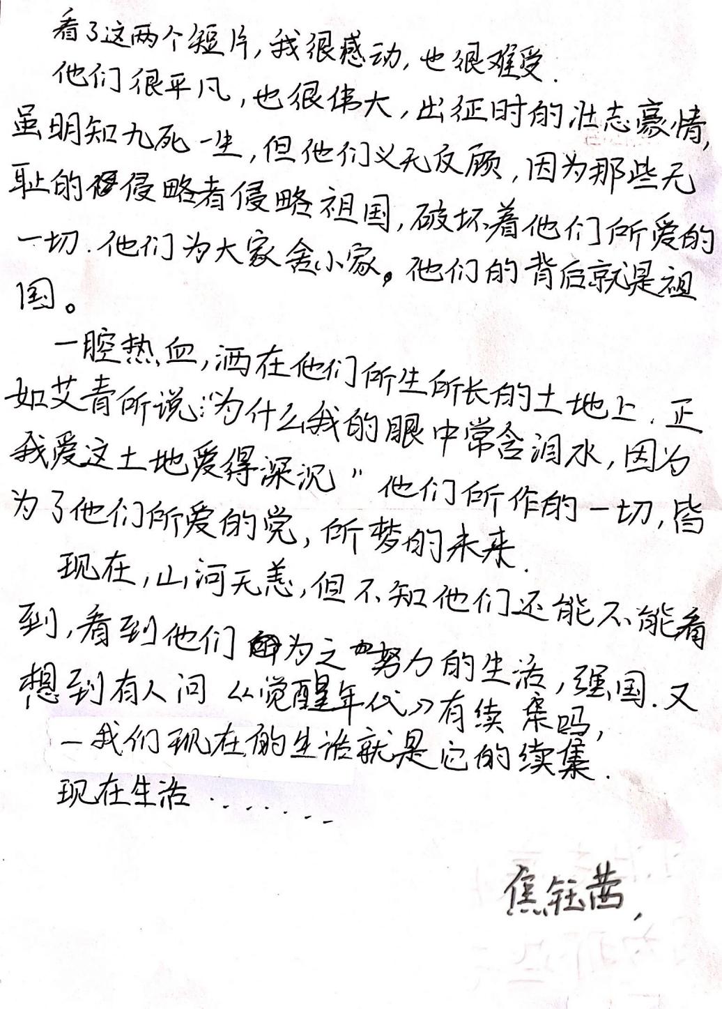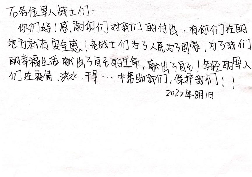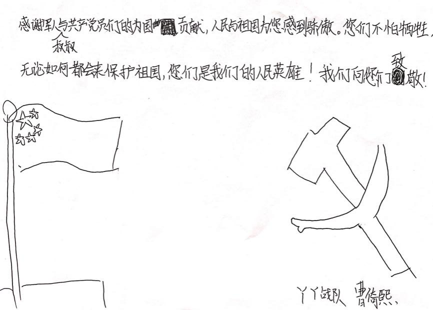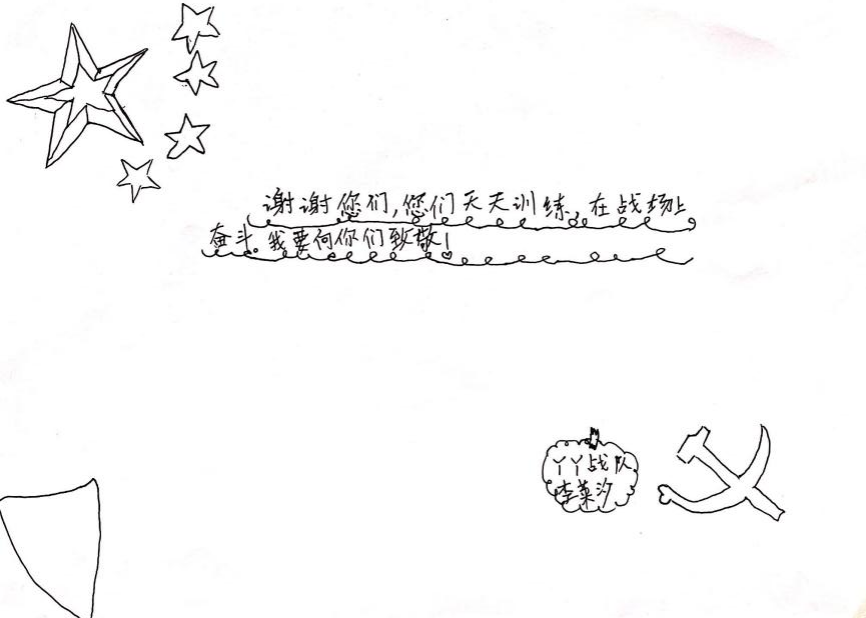 晚上七点,同学们在我院志愿者们的带领下来到教室。预备党员张颖珍、王亚婷、杨五洲、万清及青年团员蒋汶学在带队老师的指导下主动策划了建军节主题活动。首先,由张颖珍介绍建军节的由来,她带领同学们观看了由人民日报制作的庆祝建军95周年的视频《如愿》,同时进行了讲解。在恩施也有一位伟大的军人,他是“共和国勋章”获得者、时代楷模张富清,杨五洲带领同学们走进张富清,了解他的伟大事迹。面对困难不屈不挠,深藏功名,淡泊名利的张富清老爷爷让孩子们备受感动。王亚婷给同学们准备了纸和笔,让大家现场写下对中国军人想说的话并进行分享。小学生焦钰茜说:“他们很平凡,也很伟大。出征时壮志豪情,虽明知九死一生,但他们义无反顾。现在山河无恙,但不知他们还能不能看到,看到他们为之努力的强国。有人问《觉醒年代》有续集吗?我们现在的生活就是它的续集。"