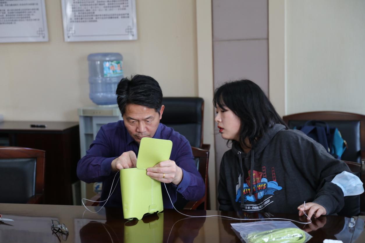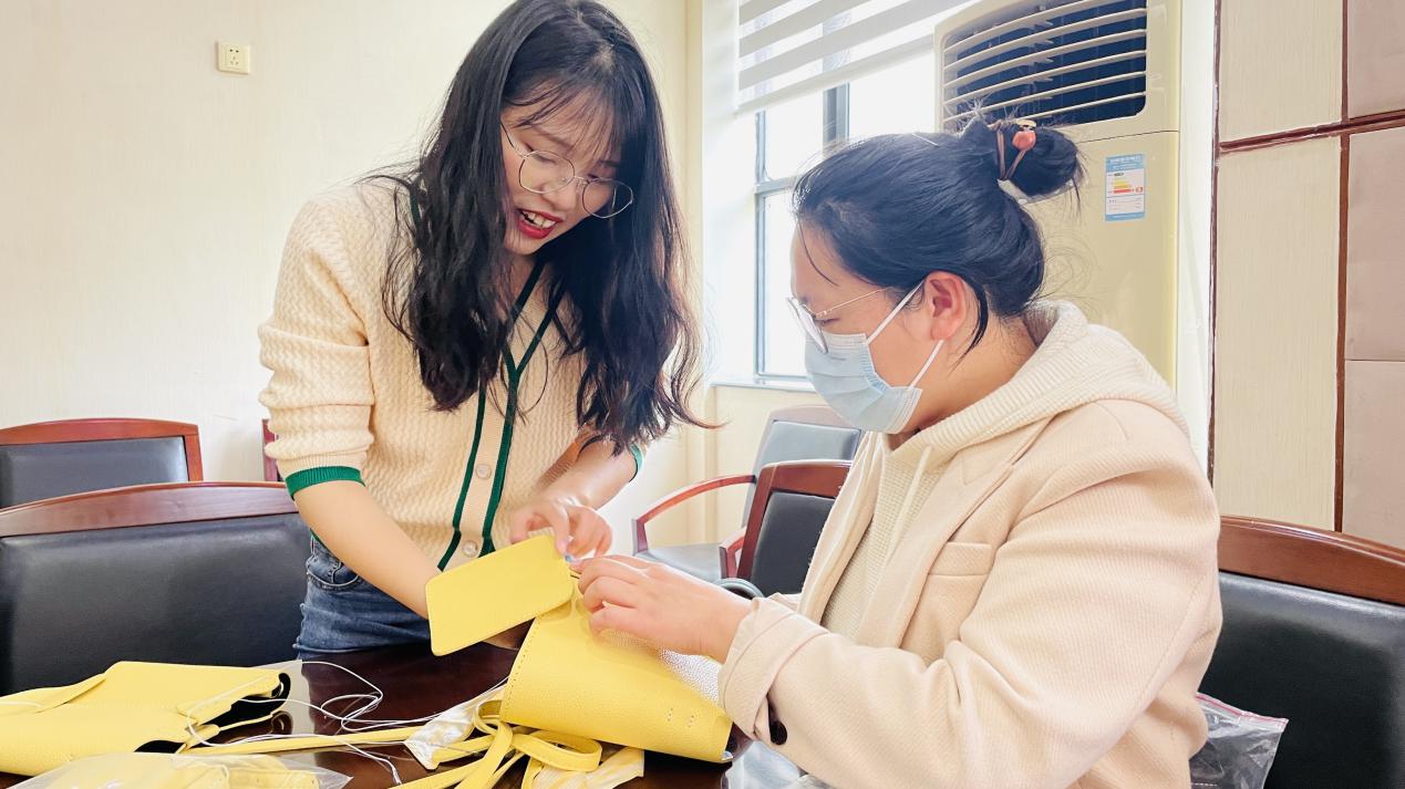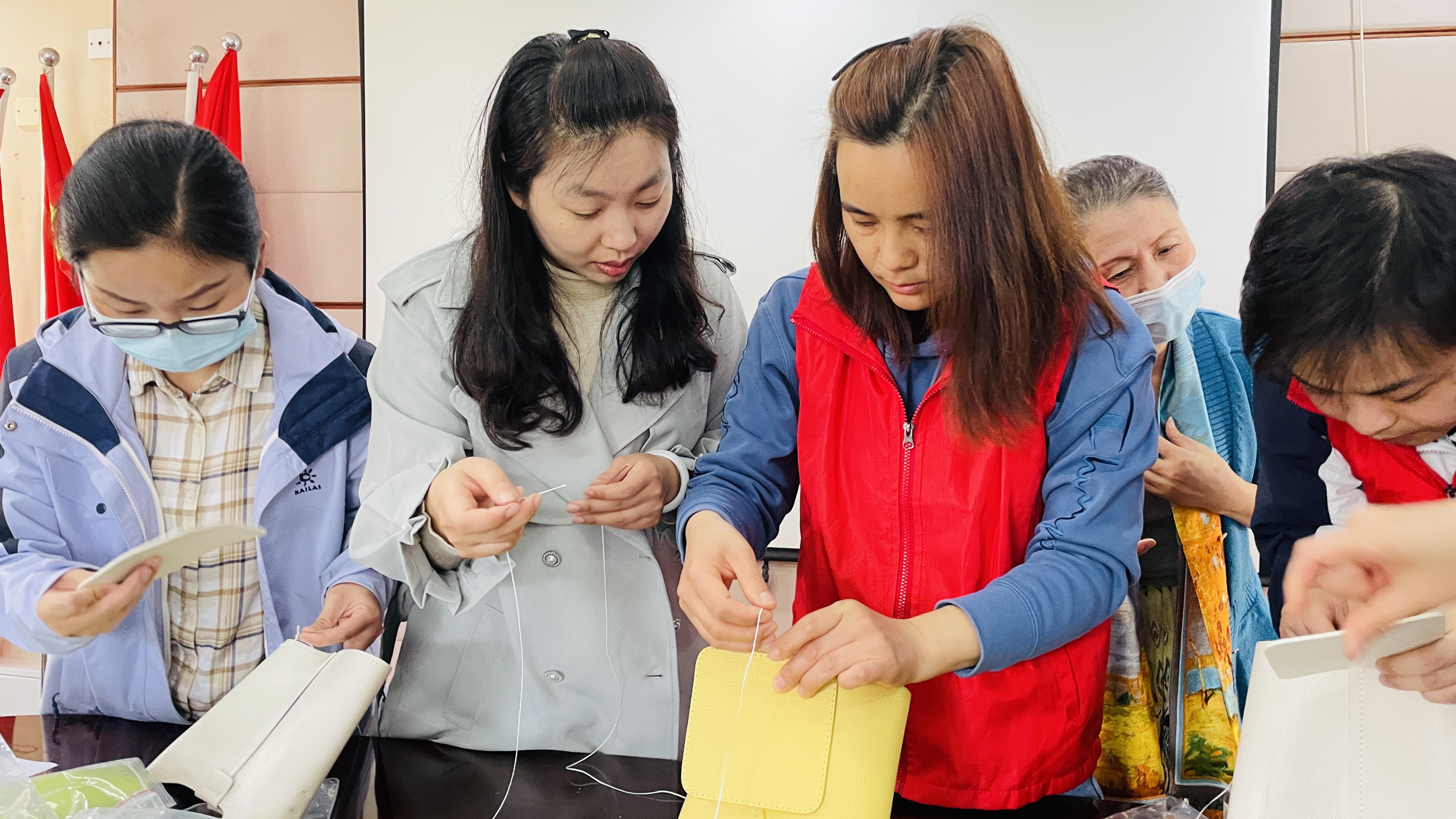 教师们在教导人员的帮助下,学习缝制包包,激发起了大家的创作积极性,教师们在创作过程中也增进了感情。先学会的老师教没有学会的老师,大家其乐融融,更像是一次家庭聚会。
