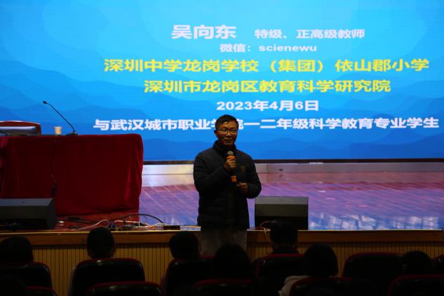 本站讯【通讯员 张金凤】4月6日14: 00-15: 00,一场基于科学的跨学科教学,在武汉城市职业学院北校区艺术楼小礼堂举行。本次讲座由特级、正高级教师吴向东老师,为初等教育学院科学教育专业的学生讲述了生动的一课,旨在开拓学生视野,增进对知识的理解,提升学生的综合能力,建立与其他学科的横向联系,将所学知识融汇贯通,形成整体性系统性的认知。