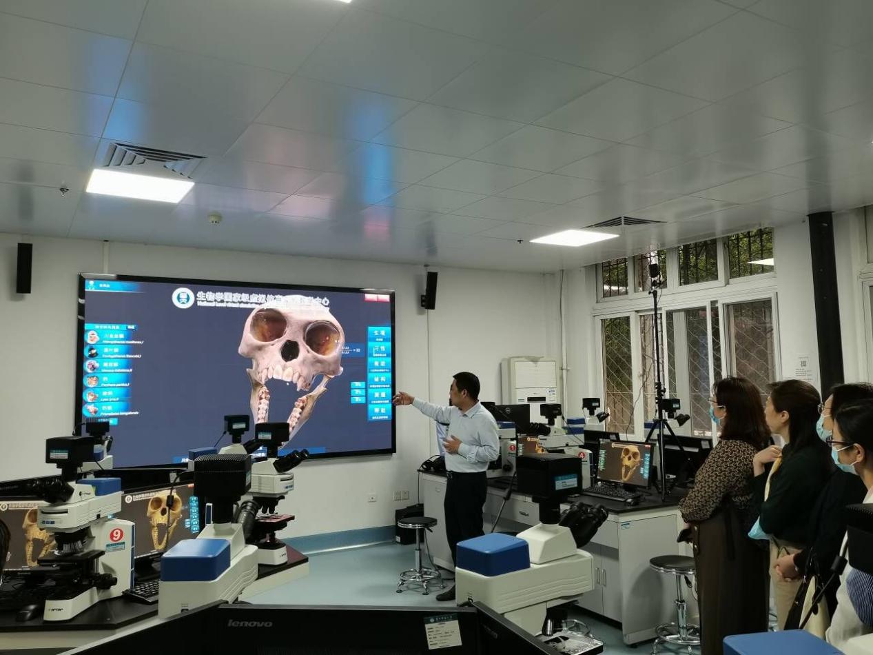 虚拟仿真实验教学中心主任李兵教授带我们参观了生命科学学院的生物学国家级虚拟仿真实验教学中心,李教授介绍到,“珍稀动物生物学习性观察研究虚拟仿真实验”是教学中心自主研发完成的,通过平台设备,可以畅游于神秘的神农架之中,鸟瞰考察神龙架的地形地貌,近距离观察金丝猴和大熊猫的生活习性,自主研究分析珍惜动物头骨。老师们通过实验教学中心平台,实际动手操作虚拟实验项目,体验最新的虚拟仿真技术,增进了老师们对最新虚拟仿真技术和虚拟仿真教学的了解。