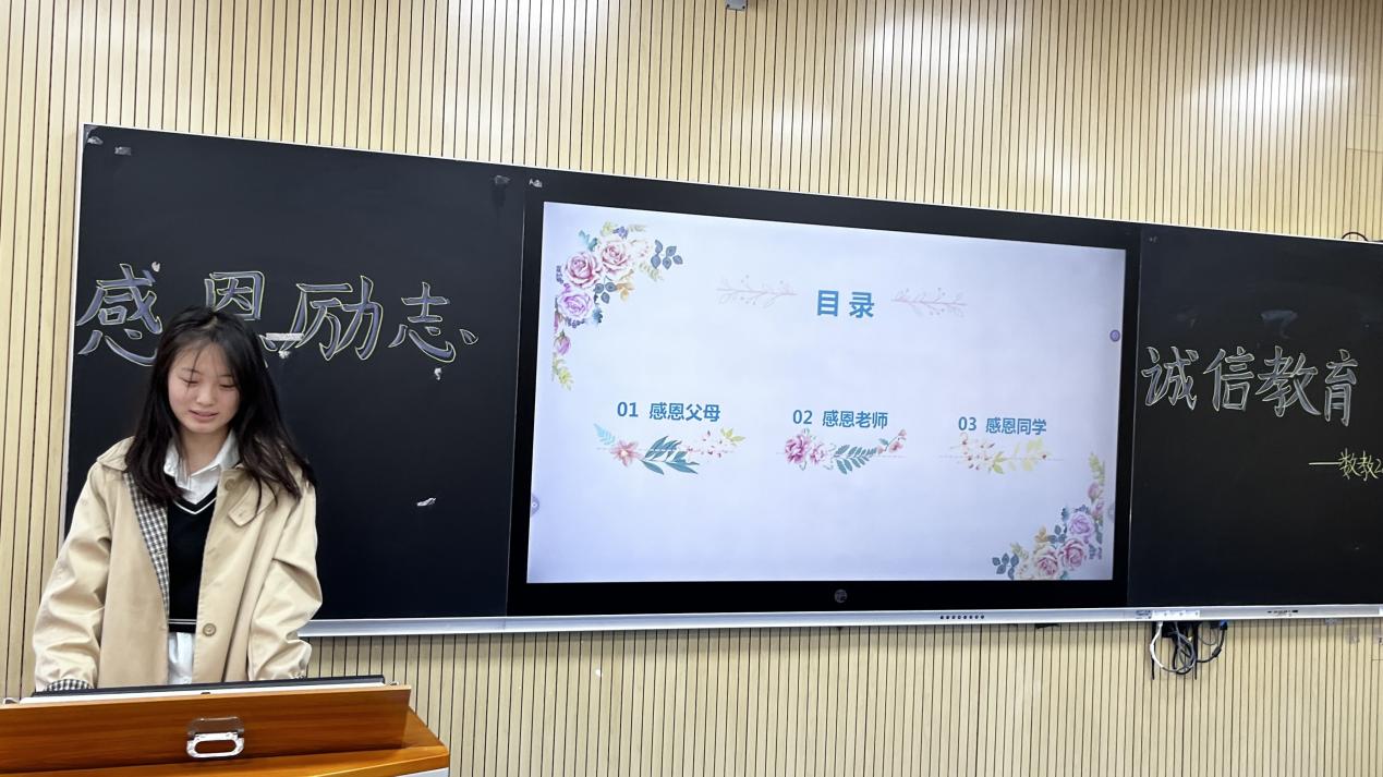 接着,各班同学积极发言,他们从各个方面谈论了“诚信、励志和感恩”,在慢慢汲取其他同学对诚信的理解的同时,他们更加体会到了其深层的含义。他们表示会时刻牢记诚信观念,树立正确的感恩和诚信意识。并在今后的生活中做到孝敬父母,尊敬师长,感激他人,为社会贡献自己的一份力量。