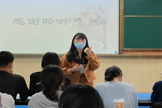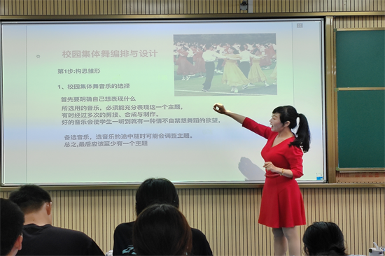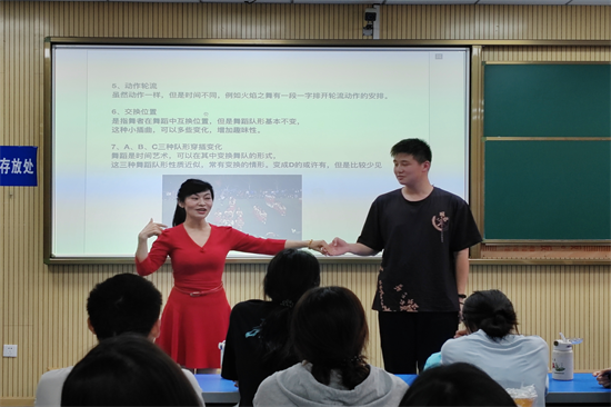 会议伊始,由匡老师讲解校园集体舞的编排与设计。匡老师表示,在编排校园集体舞时进行集体舞的雏形构思是极其重要的,需要明确舞蹈所要表达的内容,突出舞蹈主题。授课过程中,匡老师热情与台下互动,邀请同学们上台演示,以助于同学们更加深入了解舞蹈编排的流程。