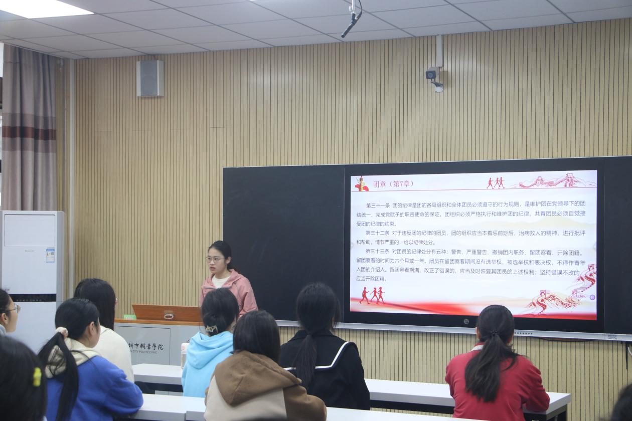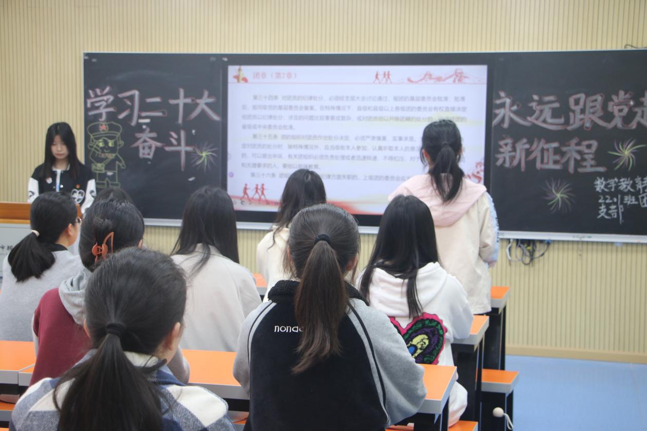各班全体成员集体诵读团章,更全面了解共青团员的基本任务,增强团员意识,深刻明确自己作为团员应承担的责任和义务。