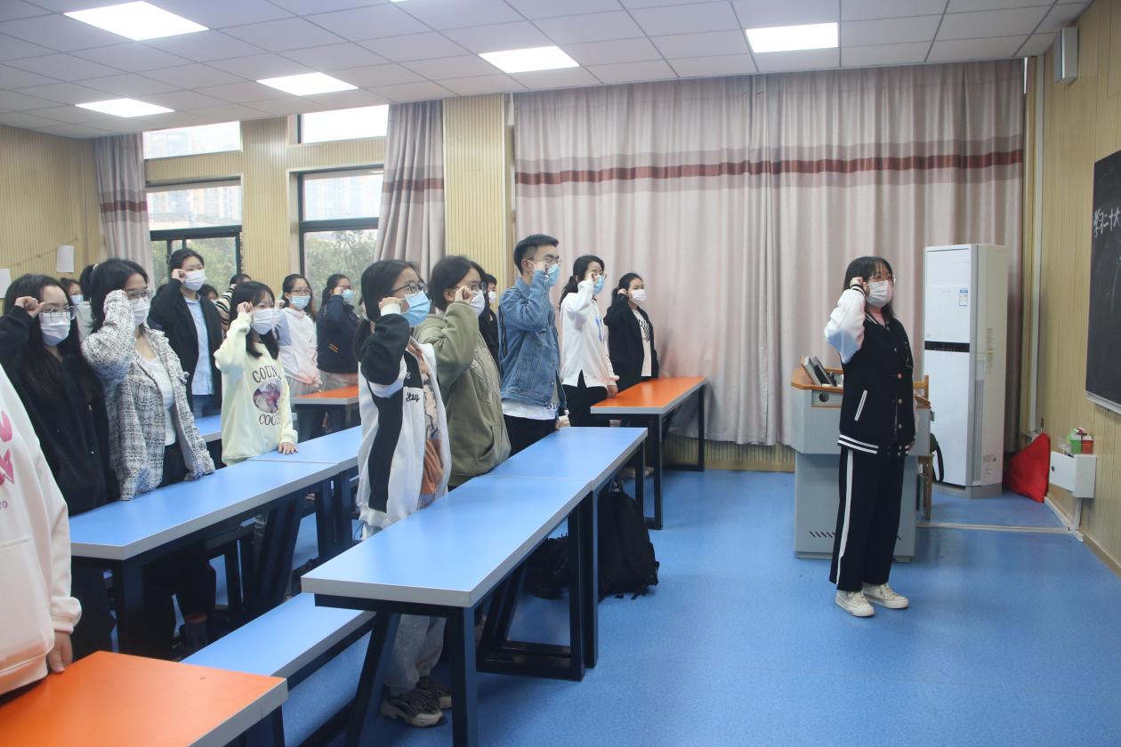 活动第一项,由各班团支书介绍团费缴纳情况。随后由团支书带领各班团员重温入团誓词,同学们激情的朗诵。