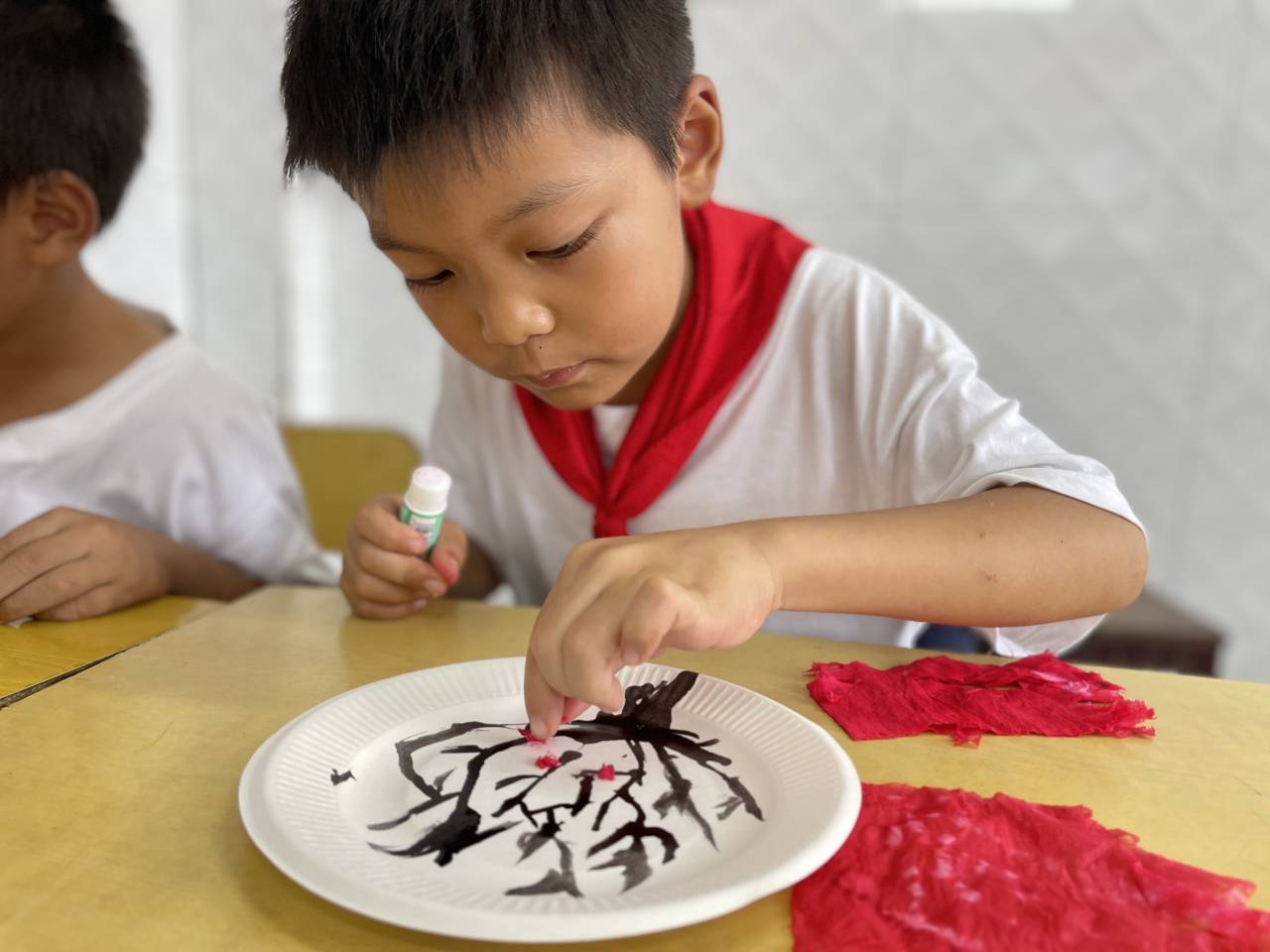 接下来小朋友们就在实践队员的指导下开始制作他们的吹墨画啦!他们把墨滴吹成形状各异的枝干,再用红纸揉搓出一朵朵玲珑的星星点点的小梅花,一幅幅充满童趣的作品在小朋友们手中诞生。
