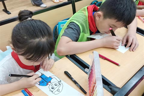 在今天的美术课程中,老师带领着小朋友们围绕爱国爱党为主题展开创作,采用沉浸式、互动式、体验式形式,引导青少年以艺术形式创作感受革命先烈的艰苦奋斗和无私奉献,从而激发他们的爱国主义情感和民族自豪感,激发他们的创造力和想象力。老师为小朋友们读了潘冬子红色英雄故事,带着小朋友们齐唱《红星闪闪》,经过一系列的课堂活动,小朋友们按捺不住自己内心的爱党爱国情感,等老师发放好材料,小朋友们立马拿起手中的画笔,在书签上描绘出红军的模样、党的旗帜、天安门广场等,尽情抒发对党和祖国的深情祝福,用实际行动表达对党和祖国的热爱。课程迎来尾声,小朋友们的历史书签也基本完成了,小朋友们拿着自己创作的书签急忙向老师和志愿者们展示自己的成果,脸上满带着笑容。