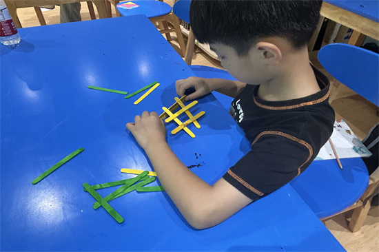 学习了桥梁的基本结构后,刘老师为小朋友们发放了小木棍,让小朋友们自己动手,开动脑筋“搭桥梁”,刚接触时许多小朋友认为没有胶水,尝试多次都不能完成,之后在志愿者和老师的帮助引导下,小的桥梁逐渐成功搭起。