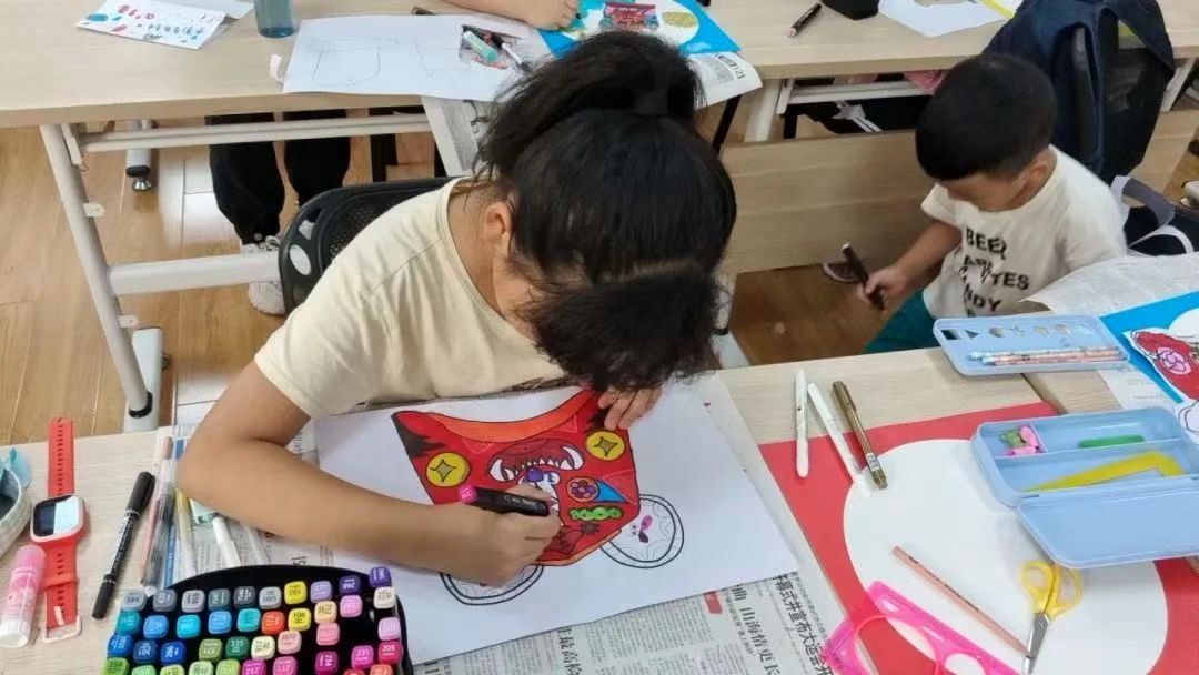 学生在老师的指导下在纸上画出属于自己的虎头帽,个个色彩丰富,线条流畅。同学们有的想象鼻子是大象的鼻子,眼睛画成一朵花,更有的同学在听了老师讲解的五毒虫在中国文化中可以驱邪的故事后,将五毒虫画到了虎头帽的设计中。这些创新的点子在同学们的绘画中淋漓尽致地展现出来。