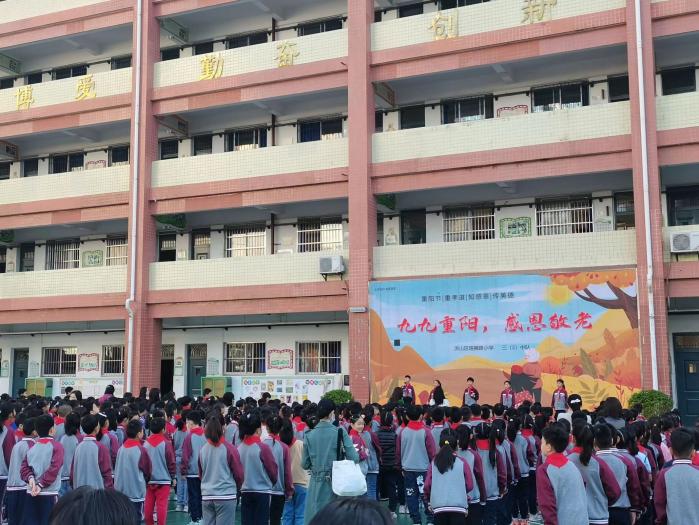 第一天是周一,我们准时来到了珞狮路小学,参加了庄严的升旗仪式。升旗仪式上,每个班的同学穿着整齐的服装,佩戴着鲜艳的红领巾,鲜艳的五星红旗迎着朝阳冉冉升起,学生们唱着国歌,仰望着红旗。周一那天正是重阳节——我国的传统节日之一,三(2)中队为我们精心准备了“重阳节,重孝道,知感恩,传美德”的节目,有朗诵诗歌、猜谜语,并准备了一个小视频,由班级同学在家帮助家人做家务的照片编辑而成,视频把“感恩敬老”的意识深刻地刻在每个人心中。