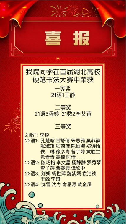 本站讯【通讯员徐彦青】近日,“踏上新征程、书写新时代”首届湖北高校硬笔书法大赛落下帷幕,我院获得一等奖1人、二等奖2人、三等奖33人。