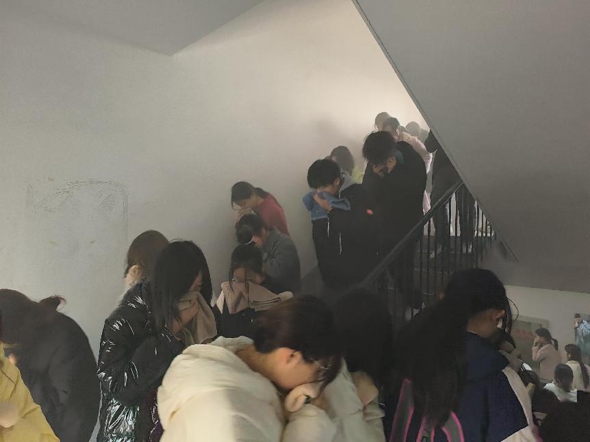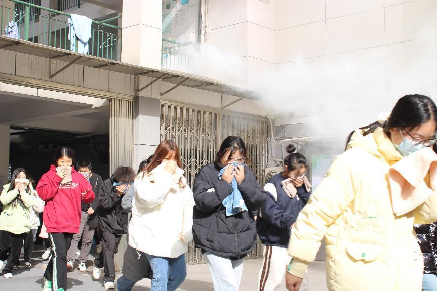 第二个环节为模拟火灾现场疏散逃生。同学们集中在公寓A栋2至3层楼。随着警报声响起,烟雾弥漫在公寓楼里。同学们纷纷用毛巾捂住口鼻,在安全员的带领下俯身快速有序地从公寓楼里撤离火灾现场,圆满地完成了此次消防演练,让同学们能够切身体会到火灾的危害以及学习正确逃生知识的重要性。