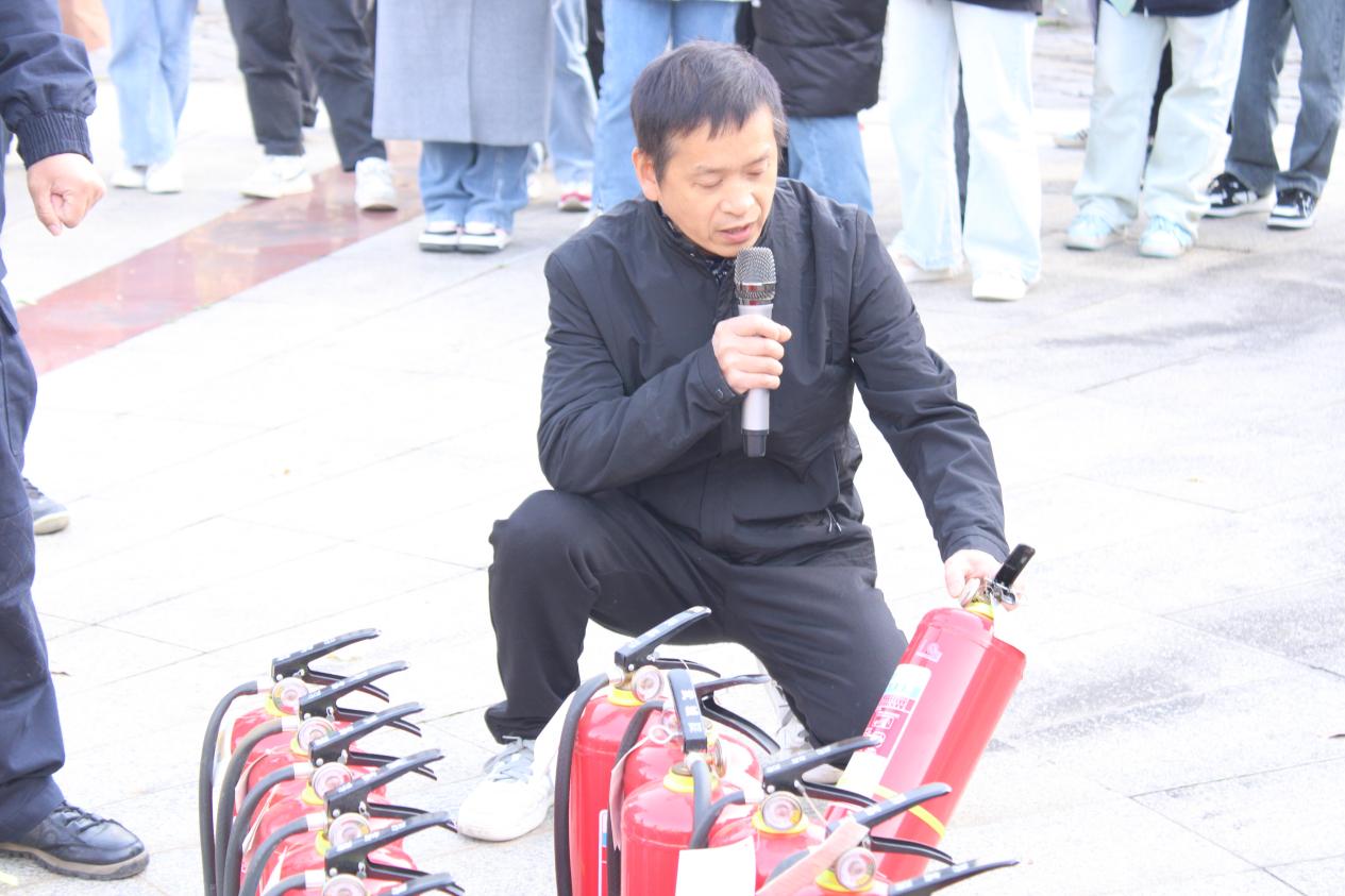 第三个环节是手提式灭火器的正确使用方法演示。为了让同学们和教职工学会正确使用灭火器,周习红老师亲自为大家讲解演示。随后学院学生、教职工都进行了手提式灭火器灭火操练。