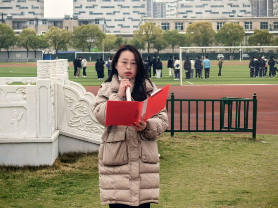 在主持人程紫雨的介绍下,来自数教2401班的陈静颐同学作为本次升旗仪式的学生代表进行发言。她引经据典,以夏明翰、邱少云等历史人物的光辉形象为镜,指出他们不仅凭借非凡的勇气和卓越的智慧,为国家的进步开辟了道路,更以坚定的信念和持续的努力,为后世树立了光辉的典范。她号召在座的每一位同学,铭记历史,从先烈们的壮举中汲取力量,将个人的梦想与追求融入国家和民族的发展洪流,用实际行动诠释爱国情怀,勇敢地承担起新时代的使命与责任。