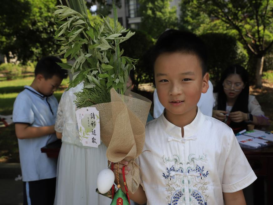 小学生们都很喜欢集市上的哥哥姐姐,他们身上的齐胸襦裙、圆领袍和发髻上的簪花、筓钗,让他们有回到唐朝的感觉。武汉城市职业学院附属学校的周同学、周同学走到艾草摊位递上铜钱,几位大姐姐很快用艾草、菖蒲、柏枝扎成了艾草花束,这花束挂在家门口就是端午节到了!