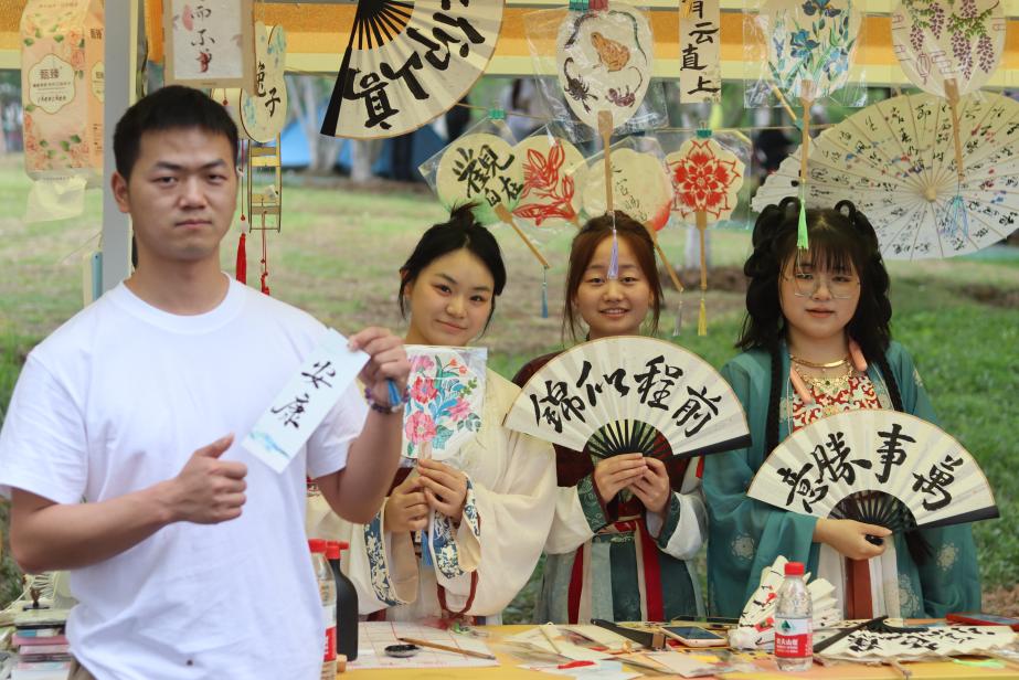来到市集的同学带上了笔墨纸砚进行现场书写,很快,飘着墨香的书法扇、书法书签就被游客们抢购一空,有的游客甚至自己动笔写起来了!