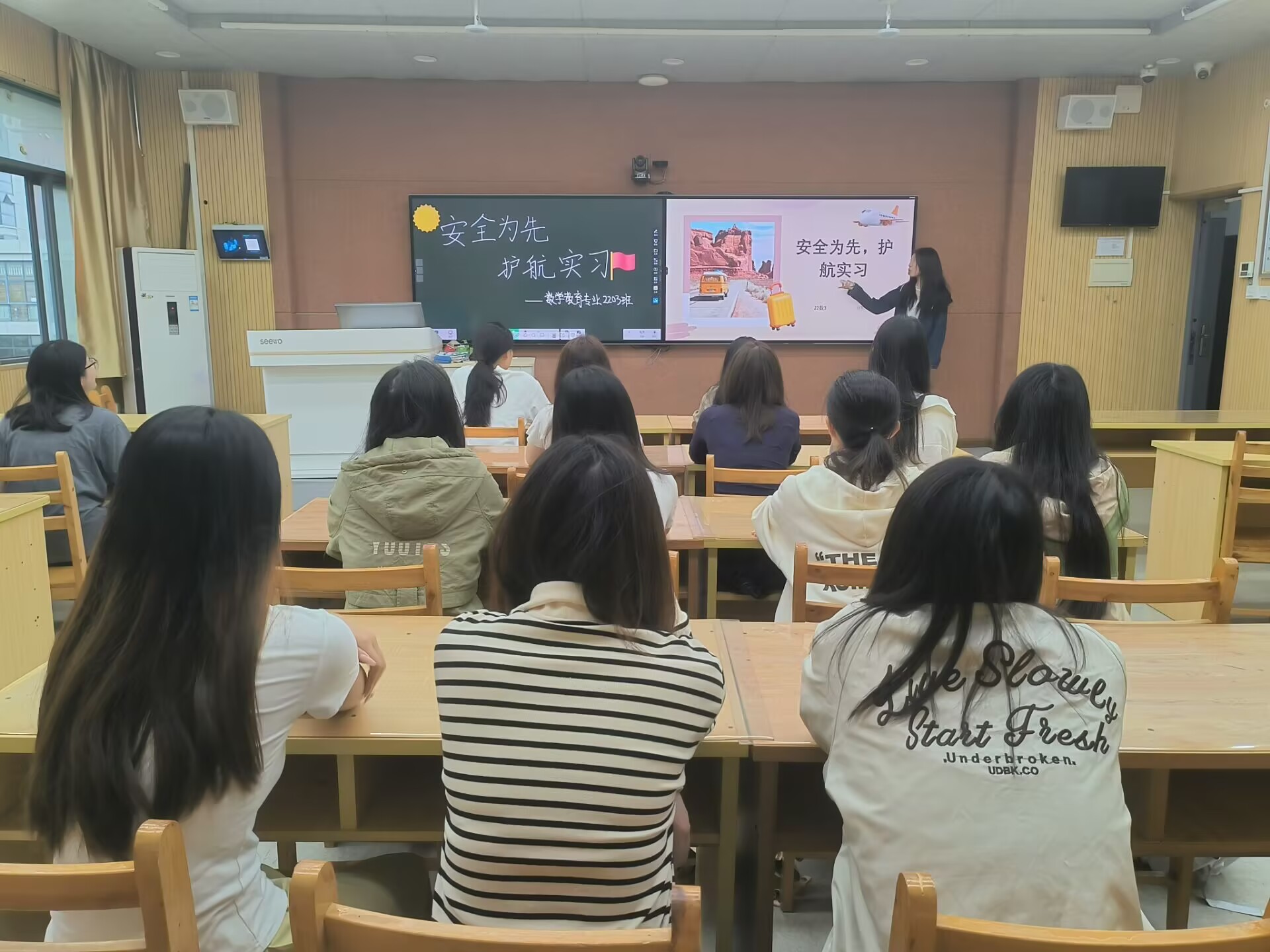 本站讯【通讯员 杜学佼】安全是实习旅程最坚实的基石无论同学们是初次接触工作岗位,还是已积累一定实践经验,安全意识始终是不可忽视的必修课。为此,初等教育学院(通识教育学院、创业学院)于五月份成功举办了以 “安全为先,护航实习” 主题班会活动,由初等教育学院22级全体师生共同参与。本次班会聚焦实习中的各类安全隐患,学习实用防护技巧,助力每一位同学高高兴兴实习去,平平安安归来时”!
