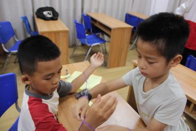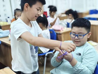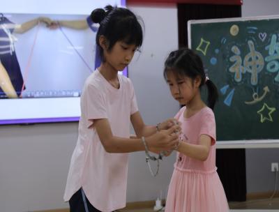 下午,实践队员开展了一堂拓扑学知识课程,为参与活动的小朋友们带来了一场充满惊喜与智慧的数学探索之旅。课程伊始,实践队员拿出一张普通的纸条,经过简单扭转粘贴后,神奇的莫比乌斯带呈现在小朋友眼前。实践队员引导小朋友们用手沿着莫比乌斯带画线,小朋友们惊奇地发现,笔不离开纸面,就能画遍莫比乌斯带的“两面”。在动手制作过程中,小朋友们全神贯注,反复尝试,当成功做出属于自己的莫比乌斯带时,教室里响起了阵阵欢呼。通过制作莫比乌斯带,小朋友们直观感受到拓扑学的奇妙。接着,实践队员展示了回形针的神奇玩法,将回形针经过巧妙的组合,原本分离的两个回形针最终连接在了一起。这一环节中,小朋友们体验了拓扑学的简单应用,切身感受到回形针与拓扑学之间的联系。双人逃脱绳子的游戏环节将课堂气氛推向高潮。游戏规则是:两个小朋友为一组,双手被交叉缠绕的绳子束缚,在不剪断绳子、不松开手的前提下,利用拓扑学的原理将绳子分开,则视为游戏成功。小朋友们两两配合,不断尝试新的方法,有的小组很快找到诀窍,成功解开绳子;没有解开绳子的小组也没有气馁,互相鼓励继续探索。课程最后,实践队员演示了光盘穿洞的神奇现象,当光盘顺利穿过纸张上的洞时,小朋友们都非常好奇其中的原理。随后,经过实践队员对光盘穿洞的详细讲解,小朋友们对拓扑学知识有了更深入的了解。这堂“数学魔法”课程,通过有趣的活动,将抽象的拓扑学知识在生动的实践操作中鲜活应用。小朋友们在动手实践、探索思考和合作交流中,感受到数学的魅力,激发了对数学的兴趣和热爱。相信这次独特的数学之旅,能够在小朋友们心中种下探索数学奥秘的种子,在未来不断生根发芽。