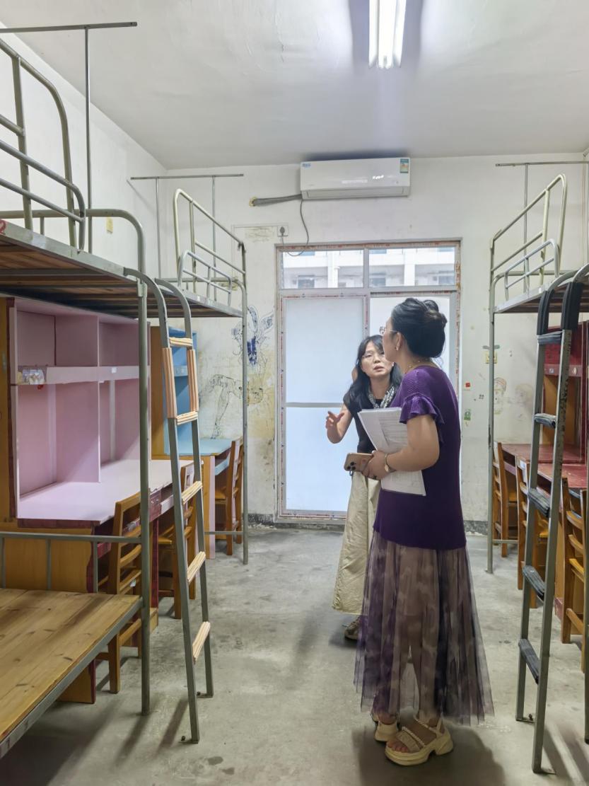 在校领导的指导与肯定下,学院党总支书记潘中锋高度重视迎新工作,统筹指导学院学工队伍扎实推进各项任务。8月27日,学院党总支副书记李春梅带领全体辅导员逐一走访了所有新生宿舍,开展设施安全与物资完备性专项检查,确保床铺、桌椅、空调、水电、门窗等设施完好可用,核对清点了生活物品是否配备齐全,确保每一间宿舍都达到“设施完好、物品齐全、环境整洁”的标准,以安全、温馨、舒适的面貌迎接2025级新同学的到来,让新生安心、家长放心。