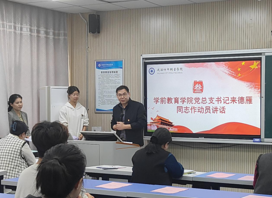 在齐唱国歌之后,由学前教育学院党总支书记来德雁老师发言。他强调全体学员要坚定理想信念,坚定共产党人的精神追求,深入学习贯彻党章,希望同学们珍惜这次党校学习的好机会,学有所思、学有所获、学有所成。