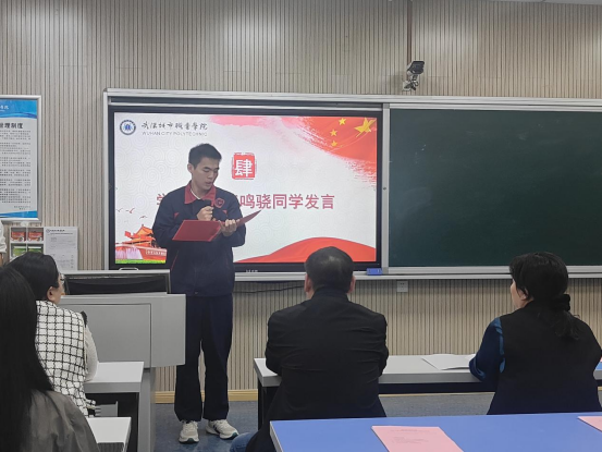 接下来,由汽车技术与服务学院王鸣骁同学代表本期党校学员发言。他表示作为退役军人,应当肩负使命,军人的纪律性、执行力与工匠精神本质相通,此次培训是提升政治素养的契机,他号召学员们认真学习,积极进取,为中国梦贡献青春力量。