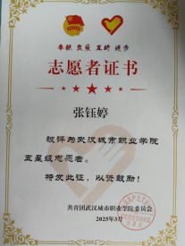 生活中,张钰婷始终践行志愿者精神,用行动传递爱与温暖。她积极参与光谷马拉松、光谷城市定向赛等各类志愿服务活动,在“洪韵山行”全民艺术普及活动、“传特色文化,承童心之梦” 社区志愿服务中表现突出,多次荣获 “优秀志愿者” 称号,获评校级 “五星级志愿者”。每一次志愿参与,都是她对责任的践行,每一份温暖传递,都是她对初心的坚守,用点滴行动诠释着青年学子的社会担当。